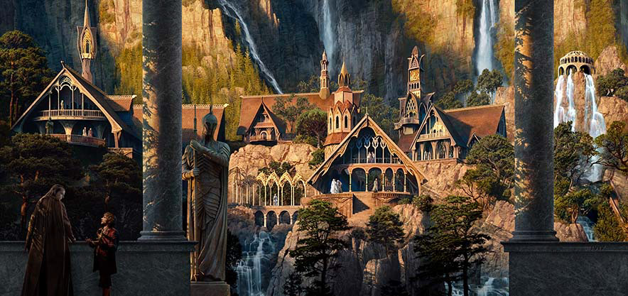 My version of the Elvish realm, based upon set designs from the 'Hobbit' and 'Lord of the Rings' movies. Some elements as well as the overall composition are a deliberate nod to the works of Maxfield Parrish.